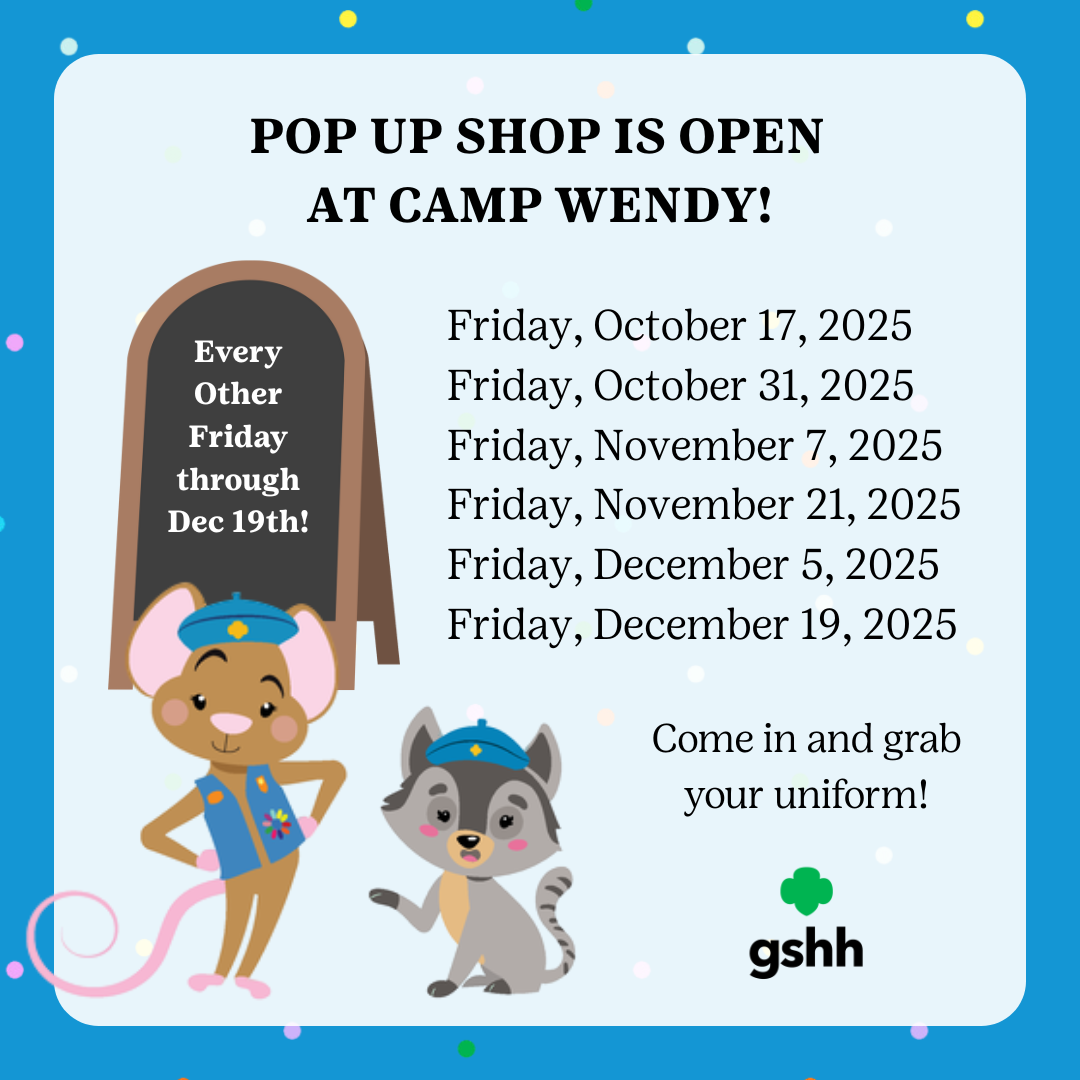 Stop by and grab your uniform necessities at our Camp Wendy pop up shop! Orders for additional items like fun patches, badges, charms and more can be placed ahead of time* for pick up at Camp Wendy as well!