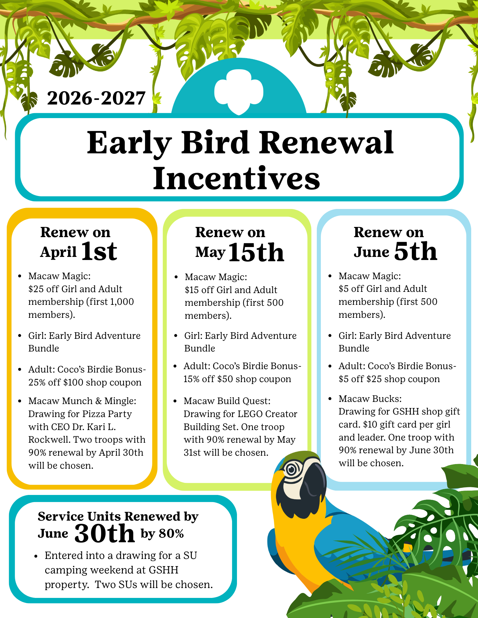 Early renewal and registration for the 2026-2027 membership year is underway! Look below for exciting incentives and promotions for girls and adults.